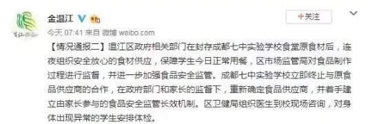 温江区政府相关部门在封存成都七中实验学校食堂原食材后,连夜组织安全放心的食材供应,保障学生今日正常用餐,区市场监管局对食品制作过程进行监督,并进一步加强食品安全监管。成都七中实验学校立即终止与原食品供应商的合作,在政府部门和家长的监督下,重新确定食品供应商,并着手建立由家长参与的食品安全监管长效机制。区卫健局组织医生到校现场咨询,对身体出现异常的学生安排体检。