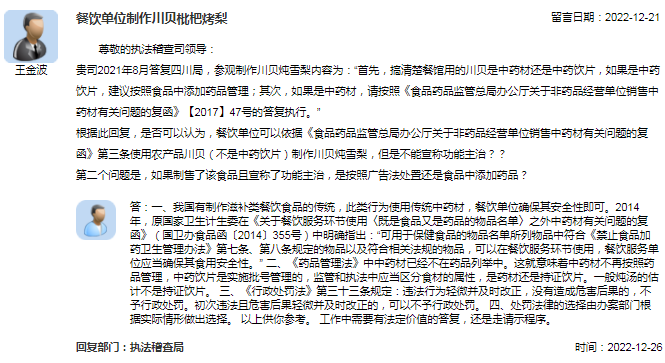 贵司2021年8月答复四川局,餐馆制作川贝炖雪梨内容为:“首先,搞清楚餐馆用的川贝是中药材还是中药饮片,如果是中药饮片,建议按照食品中添加药品管理;其次,如果是中药材,请按照《食品药品监管总局办公厅关于非药品经营单位销售中药材有关问题的复函》【2017】47号的答复执行。”