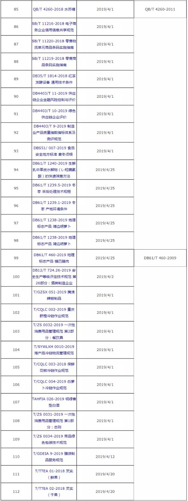 4月1日起,102项食品及相关标准正式实施。其中包括40项国家标准,5项地方标准,48项行业标准和9项团体标准。