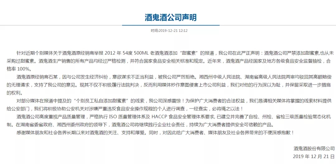 对于该举报,酒鬼酒予以否认。12月21日,酒鬼酒发布声明称,酒鬼酒严禁添加甜蜜素,也从未采购过甜蜜素。“酒鬼酒生产销售的所有产品均经过严格检测,并符合国家食品安全相关标准和规定。近年来,酒鬼酒产品经国家及地方各级食品安全监督抽检,合格率 100%”。“酒鬼酒原经销商石某,因与公司发生经济纠纷,意欲谋求不正当利益,被我公司严厉拒绝”。